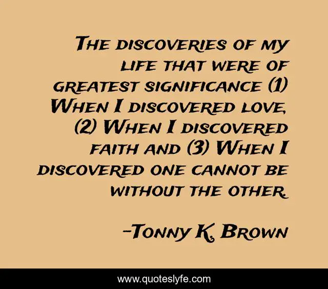 This page presents the quote "The discoveries of my life that were of greatest significance (1) When I discovered love, (2) When I discovered faith and (3) When I discovered one cannot be without the other.". Author of this quote is Tonny K. Brown. This quote is about inspirational-life, love, affection,.
