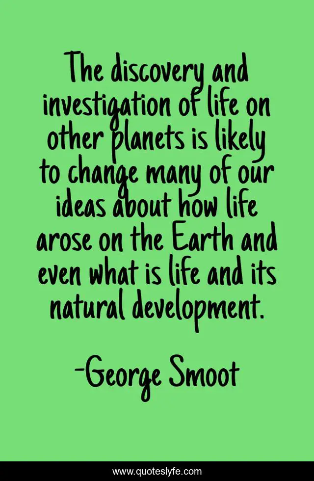 This page presents the quote "The discovery and investigation of life on other planets is likely to change many of our ideas about how life arose on the Earth and even what is life and its natural development.". Author of this quote is George Smoot. This quote is about life, ideas, change,.