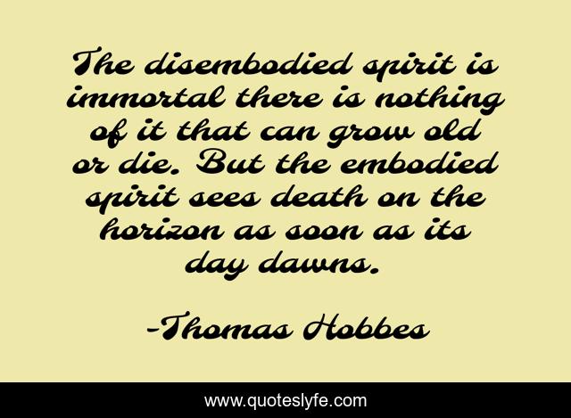 This page presents the quote "The disembodied spirit is immortal there is nothing of it that can grow old or die. But the embodied spirit sees death on the horizon as soon as its day dawns.". Author of this quote is Thomas Hobbes. This quote is about day, horizon, grow,.