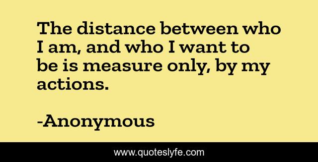 This page presents the quote "The distance between who I am, and who I want to be is measure only, by my actions.". Author of this quote is Anonymous. This quote is about enthusiasm, outlook, perspective, inspirational, point-of-view,.