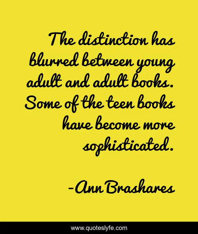 This page presents the quote "The distinction has blurred between young adult and adult books. Some of the teen books have become more sophisticated.". Author of this quote is Ann Brashares. This quote is about blurred, young, between,.