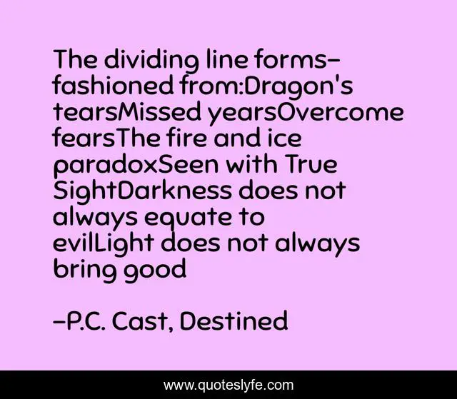 This page presents the quote "The dividing line forms-fashioned from:Dragon's tearsMissed yearsOvercome fearsThe fire and ice paradoxSeen with True SightDarkness does not always equate to evilLight does not always bring good". Author of this quote is P.C. Cast, Destined. This quote is about poem, destined,.