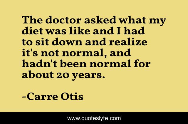 This page presents the quote "The doctor asked what my diet was like and I had to sit down and realize it's not normal, and hadn't been normal for about 20 years.". Author of this quote is Carre Otis. This quote is about down, realize, doctor,.