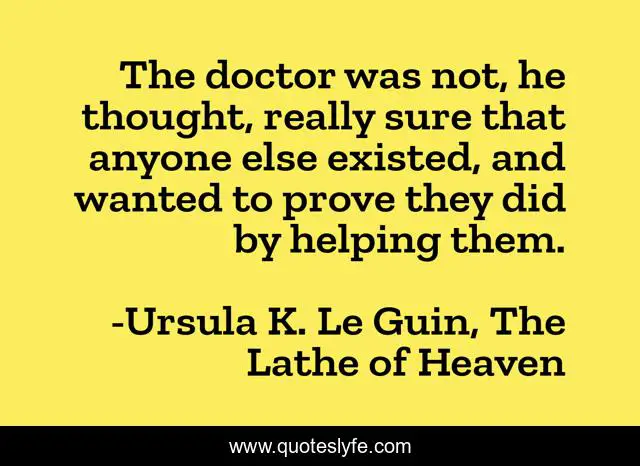 This page presents the quote "The doctor was not, he thought, really sure that anyone else existed, and wanted to prove they did by helping them.". Author of this quote is Ursula K. Le Guin, The Lathe of Heaven. This quote is about psychiatry, existence, existentialism,.