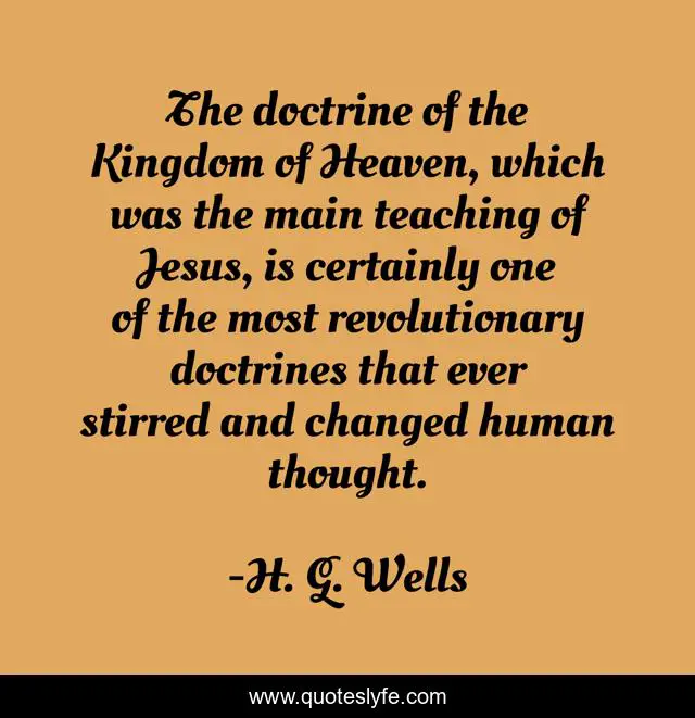 This page presents the quote "The doctrine of the Kingdom of Heaven, which was the main teaching of Jesus, is certainly one of the most revolutionary doctrines that ever stirred and changed human thought.". Author of this quote is H. G. Wells. This quote is about thought, heaven, human,.
