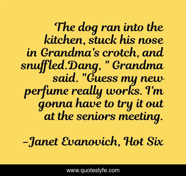 This page presents the quote "The dog ran into the kitchen, stuck his nose in Grandma's crotch, and snuffled.Dang, " Grandma said. "Guess my new perfume really works. I'm gonna have to try it out at the seniors meeting.". Author of this quote is Janet Evanovich, Hot Six. This quote is about comedy, grandma-mazur,.
