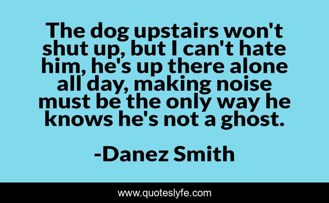 This page presents the quote "The dog upstairs won't shut up, but I can't hate him, he's up there alone all day, making noise must be the only way he knows he's not a ghost.". Author of this quote is Danez Smith. .