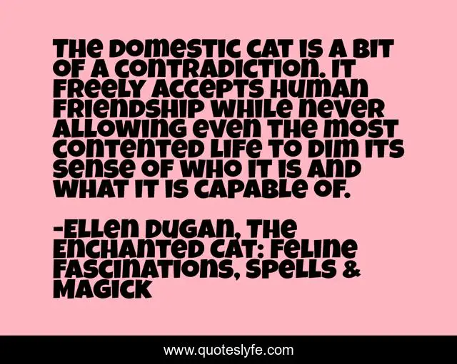 This page presents the quote "The domestic cat is a bit of a contradiction. It freely accepts human friendship while never allowing even the most contented life to dim its sense of who it is and what it is capable of.". Author of this quote is Ellen Dugan, The Enchanted Cat: Feline Fascinations, Spells & Magick. This quote is about cats, magick,.