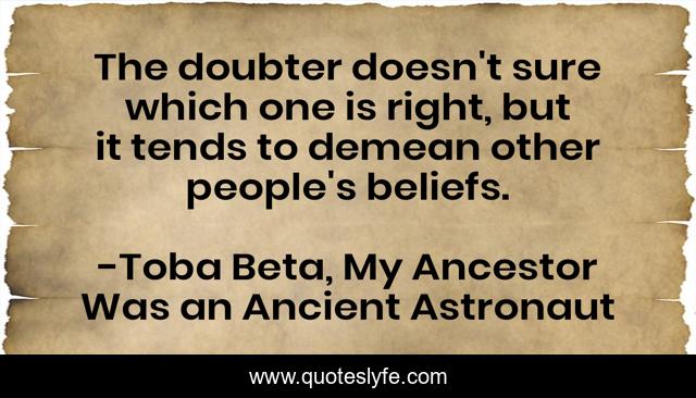 This page presents the quote "The doubter doesn't sure which one is right, but it tends to demean other people's beliefs.". Author of this quote is Toba Beta, My Ancestor Was an Ancient Astronaut. This quote is about doubt, question, others,.