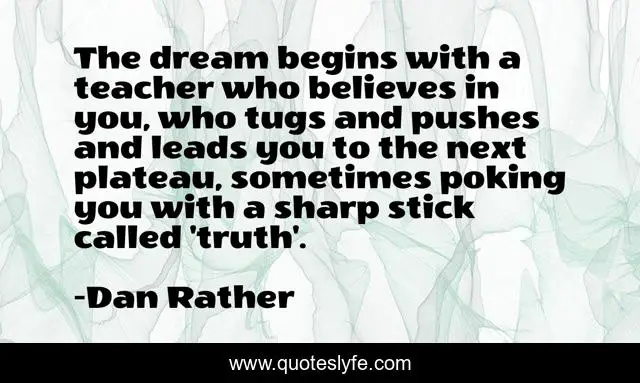 This page presents the quote "The dream begins with a teacher who believes in you, who tugs and pushes and leads you to the next plateau, sometimes poking you with a sharp stick called 'truth'.". Author of this quote is Dan Rather. This quote is about dream, truth,.