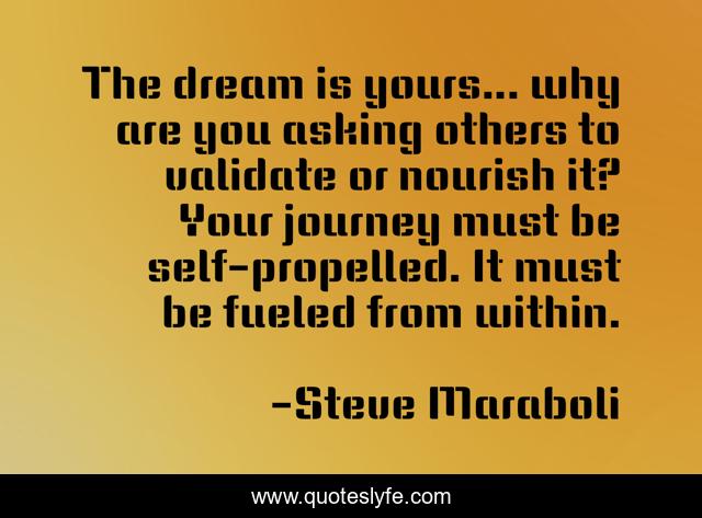 This page presents the quote "The dream is yours… why are you asking others to validate or nourish it? Your journey must be self-propelled. It must be fueled from within.". Author of this quote is Steve Maraboli. This quote is about life, dream, goals, success,.