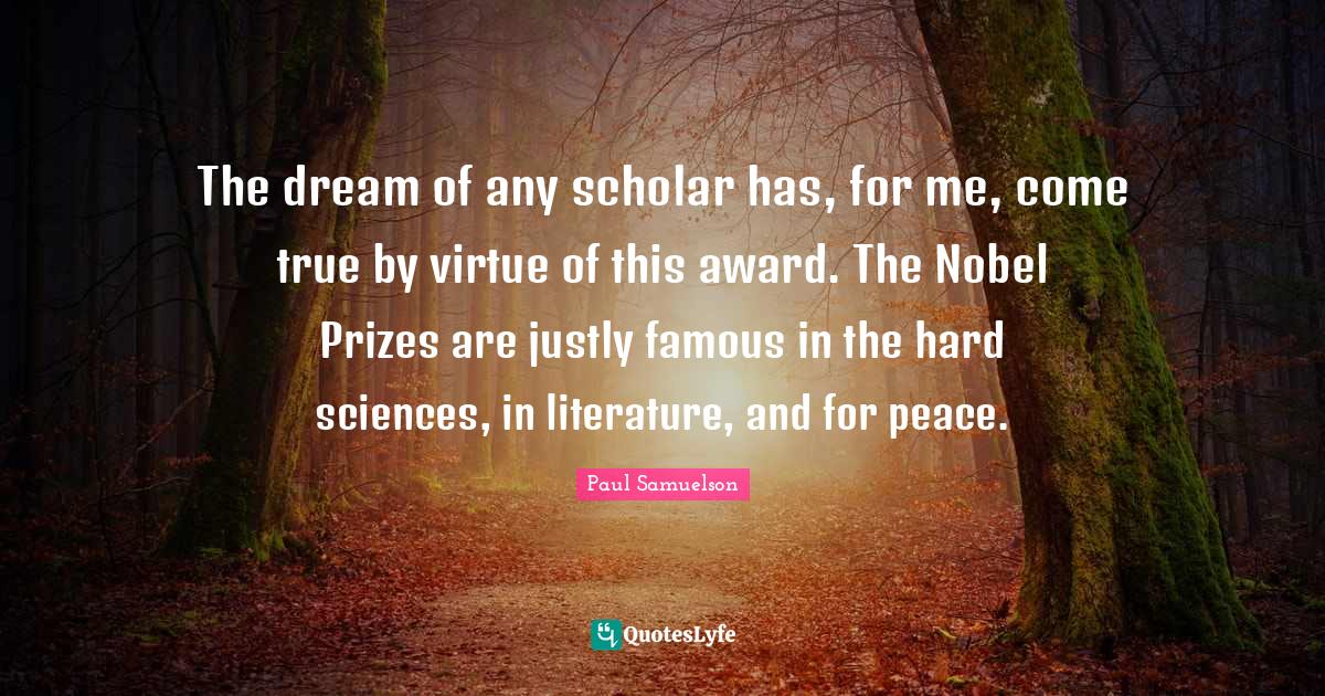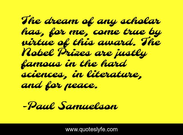 This page presents the quote "The dream of any scholar has, for me, come true by virtue of this award. The Nobel Prizes are justly famous in the hard sciences, in literature, and for peace.". Author of this quote is Paul Samuelson. This quote is about me, peace, dream,.