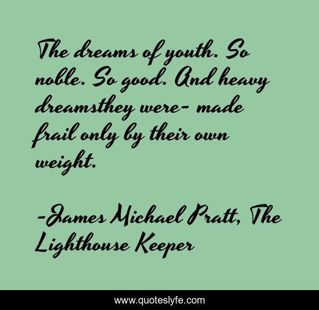 This page presents the quote "The dreams of youth. So noble. So good. And heavy dreamsthey were- made frail only by their own weight.". Author of this quote is James Michael Pratt, The Lighthouse Keeper. This quote is about youth, dreams, hope,.