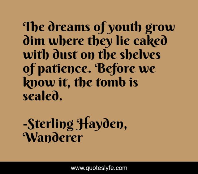 This page presents the quote "The dreams of youth grow dim where they lie caked with dust on the shelves of patience. Before we know it, the tomb is sealed.". Author of this quote is Sterling Hayden, Wanderer. .