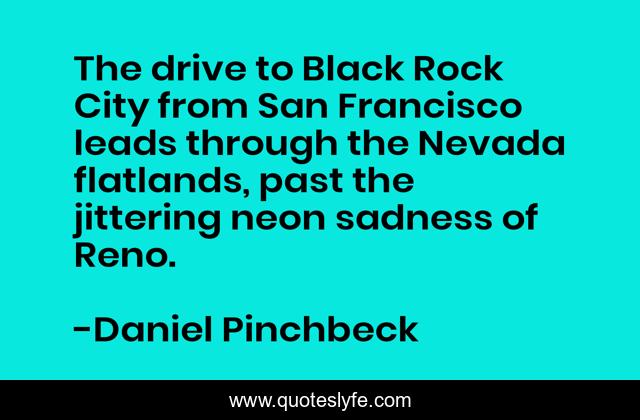 This page presents the quote "The drive to Black Rock City from San Francisco leads through the Nevada flatlands, past the jittering neon sadness of Reno.". Author of this quote is Daniel Pinchbeck. This quote is about beautiful, travel, places,.