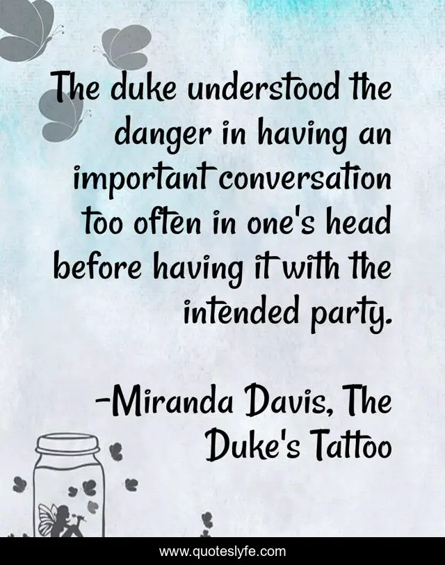 This page presents the quote "The duke understood the danger in having an important conversation too often in one's head before having it with the intended party.". Author of this quote is Miranda Davis, The Duke's Tattoo. .