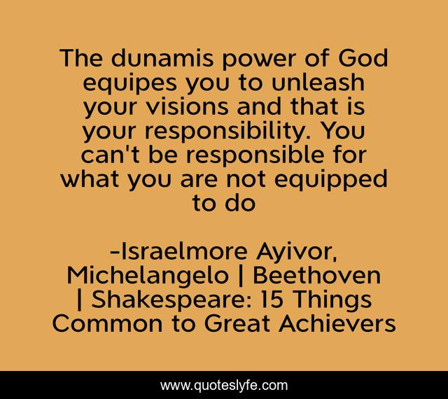This page presents the quote "The dunamis power of God equipes you to unleash your visions and that is your responsibility. You can't be responsible for what you are not equipped to do". Author of this quote is Israelmore Ayivor, Michelangelo | Beethoven | Shakespeare: 15 Things Common to Great Achievers. This quote is about dunamis, equips, food-for-thought, power-of-god, power, unleash, god, responsible, responsibility,.