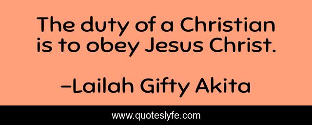 This page presents the quote "The duty of a Christian is to obey Jesus Christ.". Author of this quote is Lailah Gifty Akita. This quote is about duty, jesus-christ, christian, obey, religion-spirituality, christianity, obey-god, inspirational, enthusiasm,.
