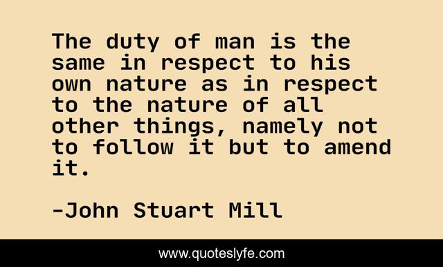 This page presents the quote "The duty of man is the same in respect to his own nature as in respect to the nature of all other things, namely not to follow it but to amend it.". Author of this quote is John Stuart Mill. This quote is about duty, nature, man,.