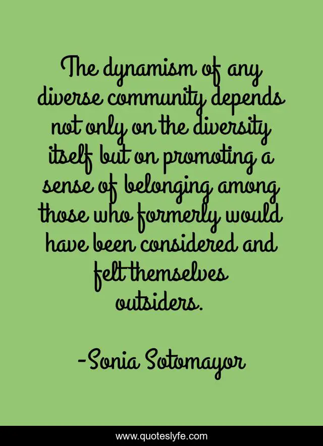 This page presents the quote "The dynamism of any diverse community depends not only on the diversity itself but on promoting a sense of belonging among those who formerly would have been considered and felt themselves outsiders.". Author of this quote is Sonia Sotomayor. This quote is about diversity, community,.