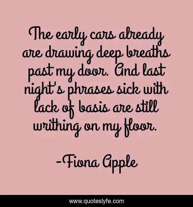 This page presents the quote "The early cars already are drawing deep breaths past my door. And last night's phrases sick with lack of basis are still writhing on my floor.". Author of this quote is Fiona Apple. .