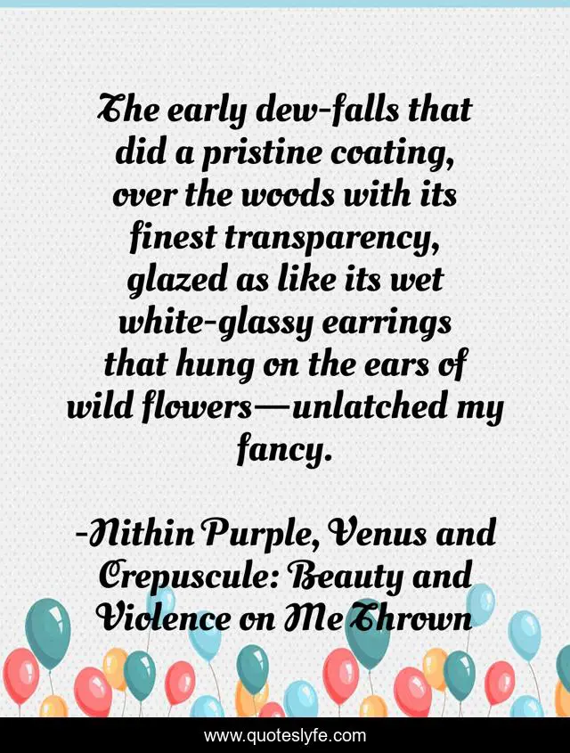 This page presents the quote "The early dew-falls that did a pristine coating, over the woods with its finest transparency, glazed as like its wet white-glassy earrings that hung on the ears of wild flowers—unlatched my fancy.". Author of this quote is Nithin Purple, Venus and Crepuscule: Beauty and Violence on Me Thrown. This quote is about atmosphere, love, poesy, fancy, quotes, wildflowers, fanciful, quotes-of-life, poetic-justice,.