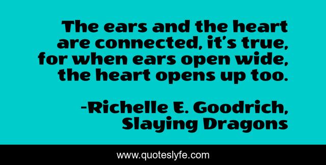 This page presents the quote "The ears and the heart are connected, it’s true, for when ears open wide, the heart opens up too.". Author of this quote is Richelle E. Goodrich, Slaying Dragons. This quote is about caring, heart, richelle-e-goodrich, richelle, listening, open-ears, richelle-goodrich, open-heart, ears,.