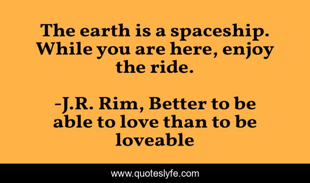 This page presents the quote "The earth is a spaceship. While you are here, enjoy the ride.". Author of this quote is J.R. Rim, Better to be able to love than to be loveable. This quote is about earth, ride, journey, spaceship, space,.