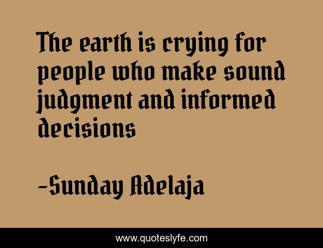 This page presents the quote "The earth is crying for people who make sound judgment and informed decisions". Author of this quote is Sunday Adelaja. This quote is about sound, people, make, informed, judgement, crying, earth, decisions,.