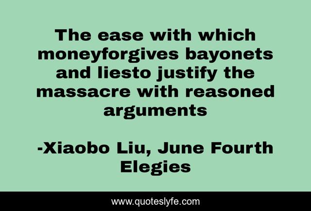 This page presents the quote "The ease with which moneyforgives bayonets and liesto justify the massacre with reasoned arguments". Author of this quote is Xiaobo Liu, June Fourth Elegies. This quote is about oppression, military-industrial-complex, war,.