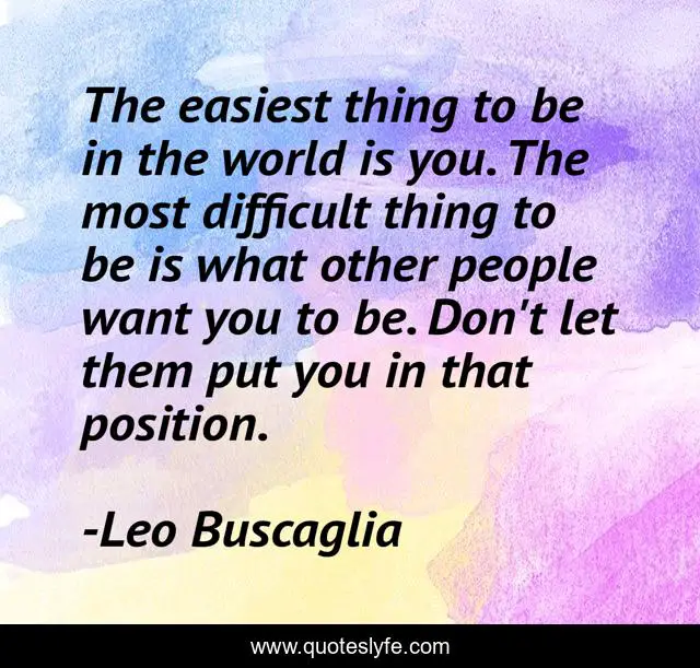 This page presents the quote "The easiest thing to be in the world is you. The most difficult thing to be is what other people want you to be. Don't let them put you in that position.". Author of this quote is Leo Buscaglia. This quote is about be-yourself, enthusiasm, inspirational, self-determination,.