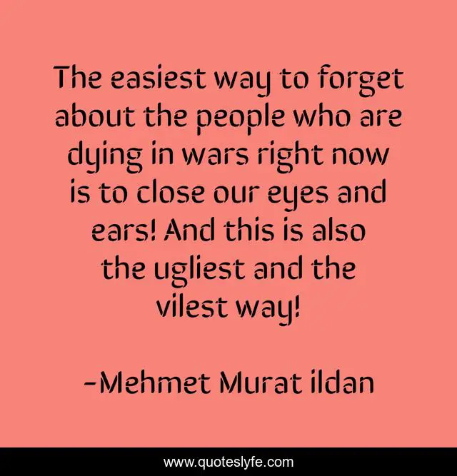 This page presents the quote "The easiest way to forget about the people who are dying in wars right now is to close our eyes and ears! And this is also the ugliest and the vilest way!". Author of this quote is Mehmet Murat ildan. This quote is about death, dying, ildan-wise-sayings, turkish, anti-war-movement, turkish-playwrights, vilest, wars, turkish-wisdom-words,.