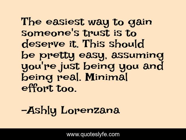 This page presents the quote "The easiest way to gain someone's trust is to deserve it. This should be pretty easy, assuming you're just being you and being real. Minimal effort too.". Author of this quote is Ashly Lorenzana. This quote is about real, honesty, people, charm, gain, trust, effort, identity,.