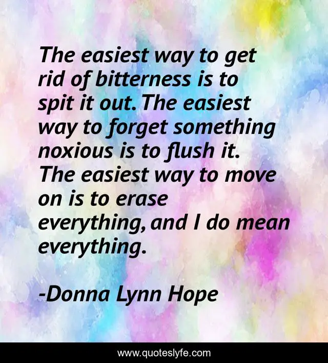 This page presents the quote "The easiest way to get rid of bitterness is to spit it out. The easiest way to forget something noxious is to flush it. The easiest way to move on is to erase everything, and I do mean everything.". Author of this quote is Donna Lynn Hope. This quote is about breaking-up, breakup, bitterness, forgetting,.