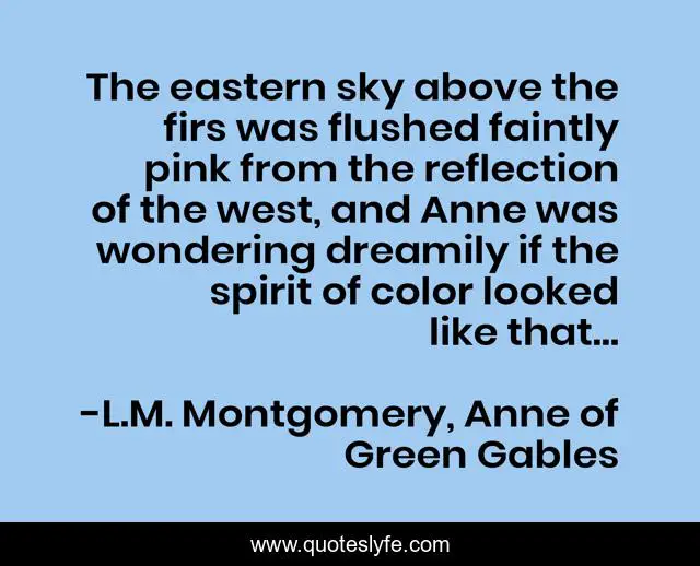 This page presents the quote "The eastern sky above the firs was flushed faintly pink from the reflection of the west, and Anne was wondering dreamily if the spirit of color looked like that…". Author of this quote is L.M. Montgomery, Anne of Green Gables. This quote is about l-m-montgomery, spirit,.