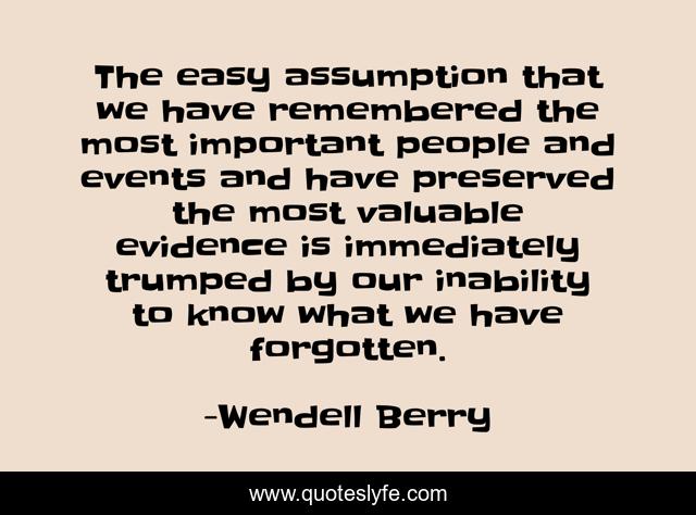 This page presents the quote "The easy assumption that we have remembered the most important people and events and have preserved the most valuable evidence is immediately trumped by our inability to know what we have forgotten.". Author of this quote is Wendell Berry. .