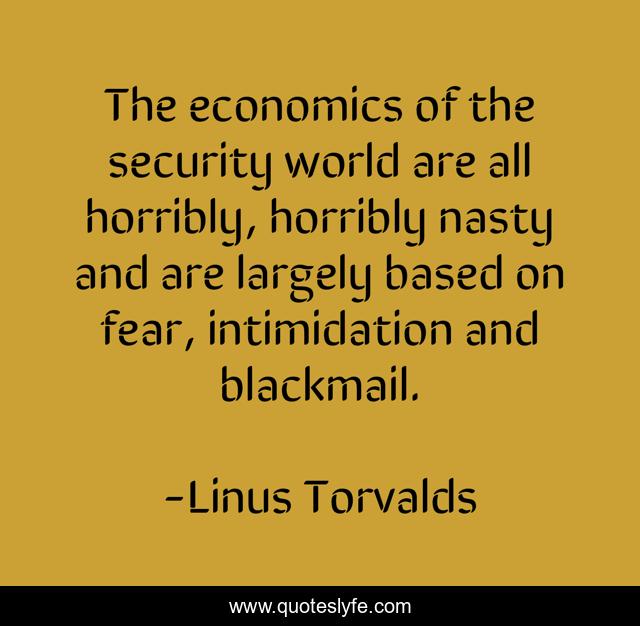 This page presents the quote "The economics of the security world are all horribly, horribly nasty and are largely based on fear, intimidation and blackmail.". Author of this quote is Linus Torvalds. This quote is about world, security, economics,.