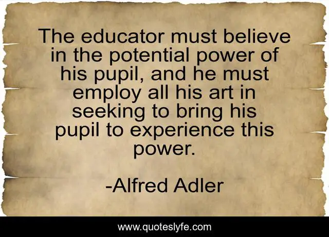 This page presents the quote "The educator must believe in the potential power of his pupil, and he must employ all his art in seeking to bring his pupil to experience this power.". Author of this quote is Alfred Adler. This quote is about believe, art, experience,.