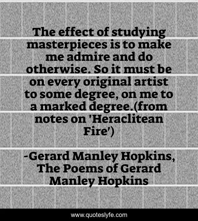 This page presents the quote "The effect of studying masterpieces is to make me admire and do otherwise. So it must be on every original artist to some degree, on me to a marked degree.(from notes on 'Heraclitean Fire')". Author of this quote is Gerard Manley Hopkins, The Poems of Gerard Manley Hopkins. .