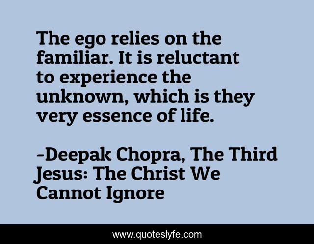 This page presents the quote "The ego relies on the familiar. It is reluctant to experience the unknown, which is they very essence of life.". Author of this quote is Deepak Chopra, The Third Jesus: The Christ We Cannot Ignore. This quote is about life, ego,.