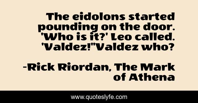 This page presents the quote "The eidolons started pounding on the door. 'Who is it?' Leo called. 'Valdez!''Valdez who?". Author of this quote is Rick Riordan, The Mark of Athena. This quote is about knock, eidolon, leo-valdez, humour,.