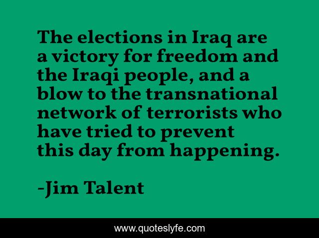 This page presents the quote "The elections in Iraq are a victory for freedom and the Iraqi people, and a blow to the transnational network of terrorists who have tried to prevent this day from happening.". Author of this quote is Jim Talent. This quote is about victory, day, people,.