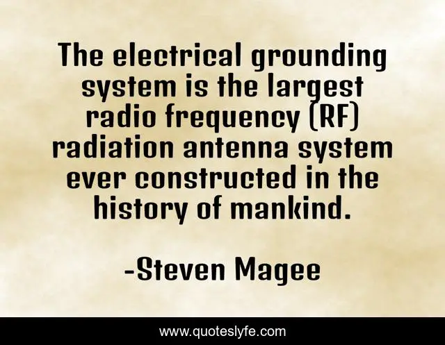 This page presents the quote "The electrical grounding system is the largest radio frequency (RF) radiation antenna system ever constructed in the history of mankind.". Author of this quote is Steven Magee. This quote is about radio, earth, constructed, antenna, radiochemistry, radiation, system, electrical, grounding,.