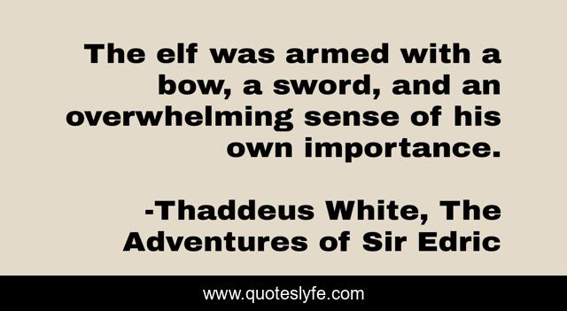 This page presents the quote "The elf was armed with a bow, a sword, and an overwhelming sense of his own importance.". Author of this quote is Thaddeus White, The Adventures of Sir Edric. This quote is about fantasy, humour,.