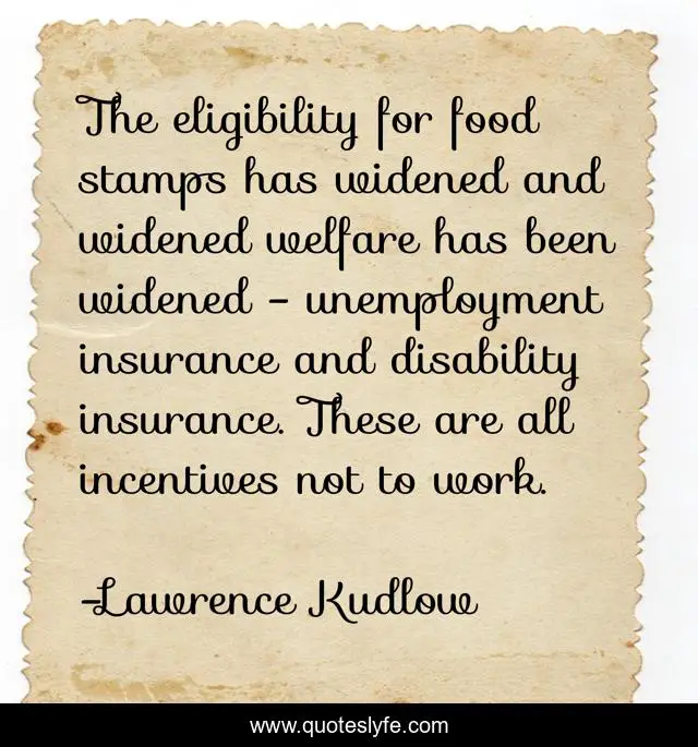 This page presents the quote "The eligibility for food stamps has widened and widened welfare has been widened - unemployment insurance and disability insurance. These are all incentives not to work.". Author of this quote is Lawrence Kudlow. This quote is about work, disability, insurance,.