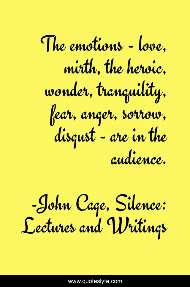 This page presents the quote "The emotions - love, mirth, the heroic, wonder, tranquility, fear, anger, sorrow, disgust - are in the audience.". Author of this quote is John Cage, Silence: Lectures and Writings. This quote is about emotion, music,.