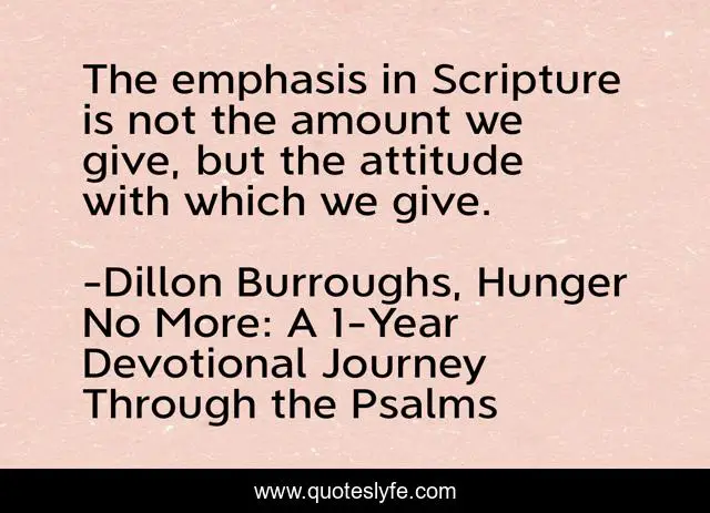 This page presents the quote "The emphasis in Scripture is not the amount we give, but the attitude with which we give.". Author of this quote is Dillon Burroughs, Hunger No More: A 1-Year Devotional Journey Through the Psalms. This quote is about giving, generosity,.