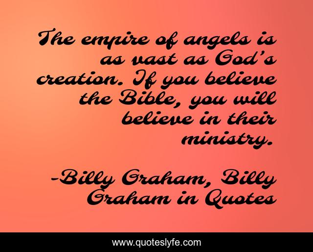 This page presents the quote "The empire of angels is as vast as God’s creation. If you believe the Bible, you will believe in their ministry.". Author of this quote is Billy Graham, Billy Graham in Quotes. This quote is about angels, billy-graham,.