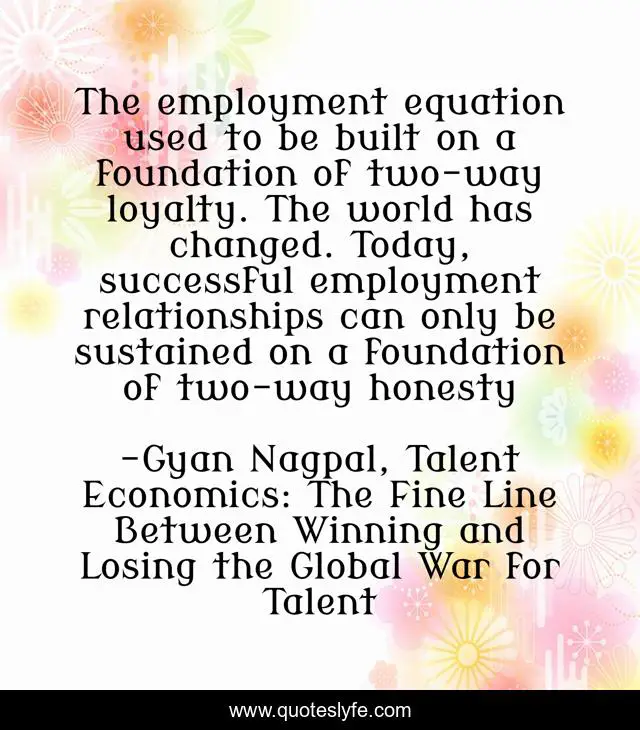 This page presents the quote "The employment equation used to be built on a foundation of two-way loyalty. The world has changed. Today, successful employment relationships can only be sustained on a foundation of two-way honesty". Author of this quote is Gyan Nagpal, Talent Economics: The Fine Line Between Winning and Losing the Global War for Talent. This quote is about management, talent, economics, employee, employment, leader,.