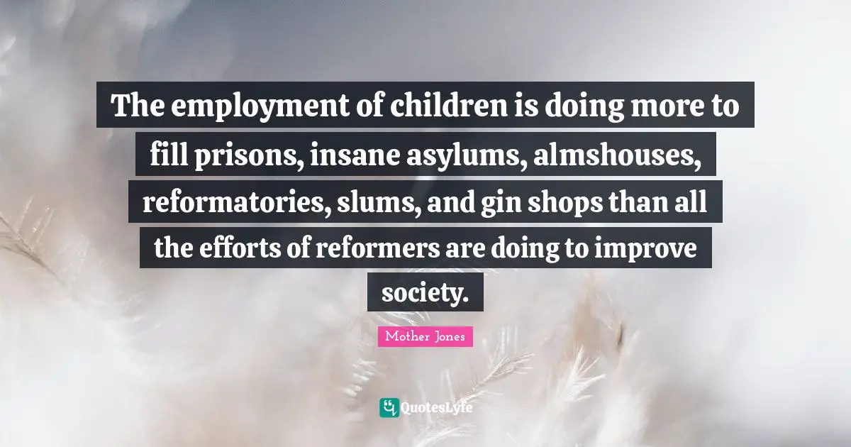This page presents the quote "The employment of children is doing more to fill prisons, insane asylums, almshouses, reformatories, slums, and gin shops than all the efforts of reformers are doing to improve society.". Author of this quote is Mother Jones. This quote is about reformers, effort, asylums, employment, insane, slums, society, gin, children,.